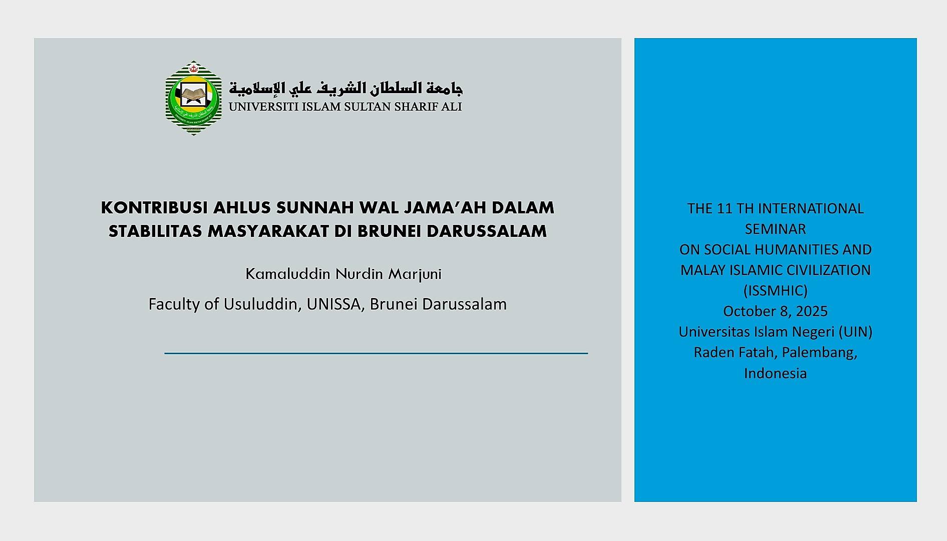 - Venue: Library, 4 th Floor, Universitas Islam Negeri Raden Fatah (UIN) Palembang, Indonesia Title: KONTRIBUSI AHLUSSUNNAH WAL JAMA’AH DALAM STABILITAS MASYARAKAT DI BRUNEI DARUSSALAM Kamaluddin Nurdin Marjuni
