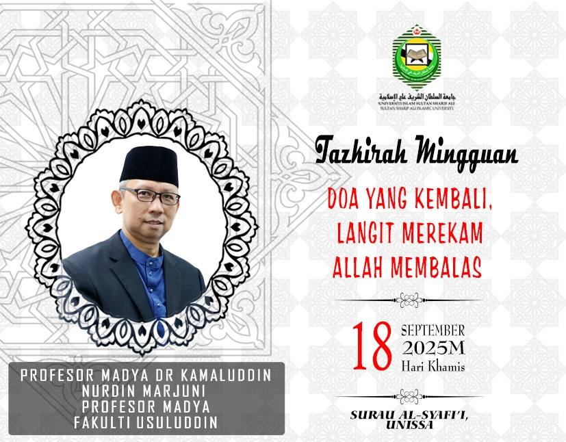 Universiti Islam Sultan Sharif Ali (UNISSA) Brunei Darussalam Tempat: Surau Al-Shafi’i, UNISSA. Tarikh: Khamis, 18/09/2025 Tajuk: DOA YANG KEMBALI “LANGIT MEREKAM, ALLAH MEMBALAS” Dalam Islam, mendoakan orang lain secara diam-diam adalah amalan yang sangat mulia. Nabi SAW bersabda bahwa doa seorang Muslim untuk saudaranya tanpa sepengetahuan orang tersebut akan diaminkan oleh malaikat, dan malaikat juga mendoakan hal yang sama untuk si pendoa.