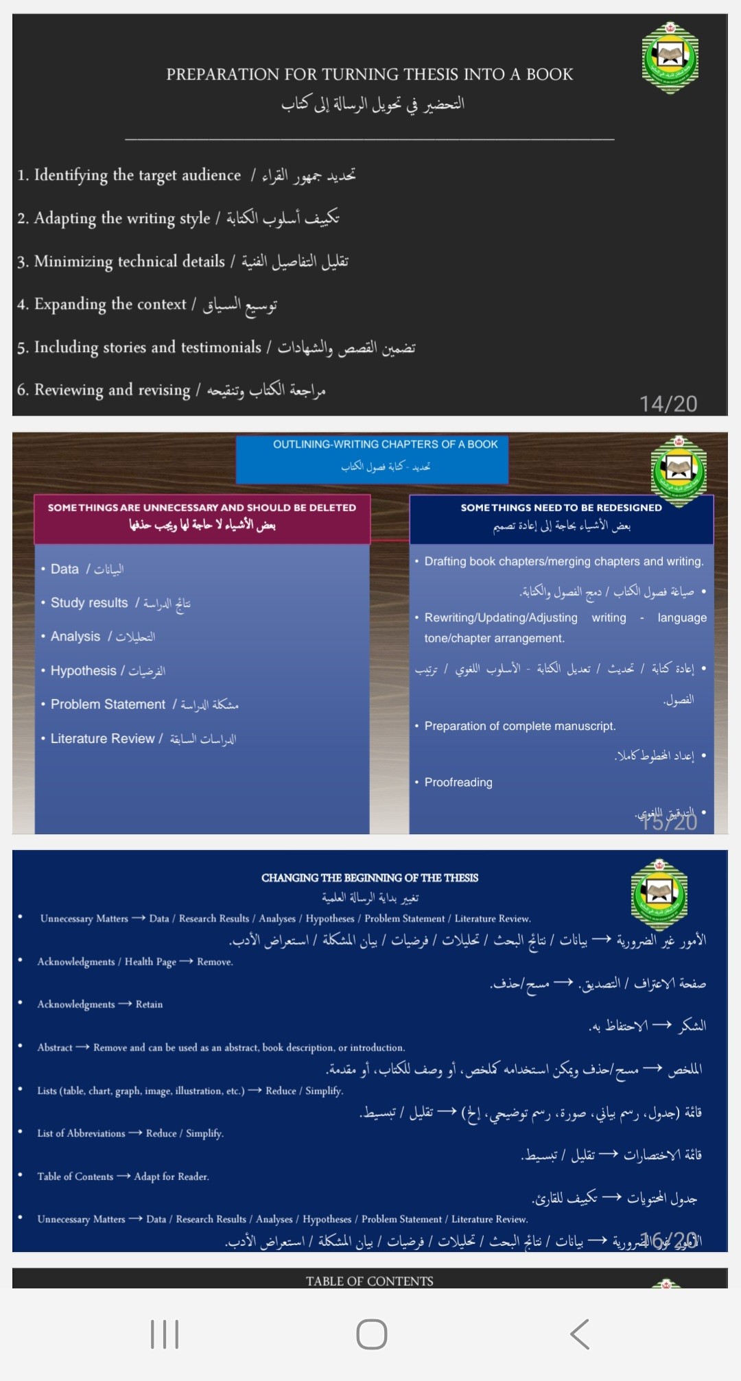 - توجيه المشاركين حول الخطوات اللازمة لتحويل أطروحاتهم العلمية -ماجستير و دكتوراه- إلى صيغة كتاب.
